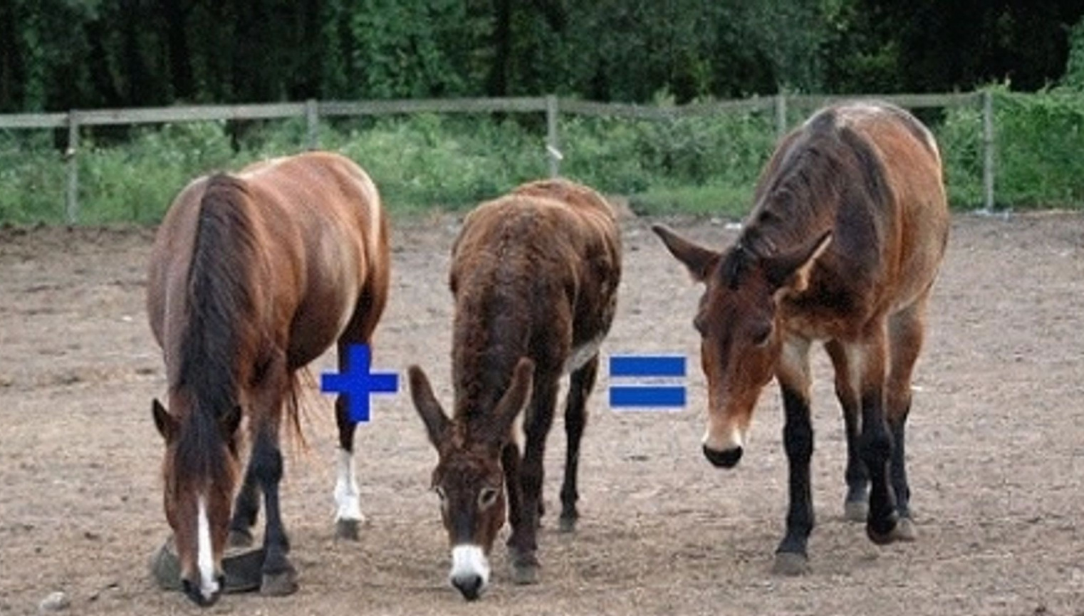 A mule is a cross between two species of equine: the horse or pony (Equus caballus) and the domestic donkey (Equus asinus). The word 'mule' is often used for either the cross of male donkey on female horse or female donkey on male horse, although the latter cross is more correctly known as a 'hinny'.