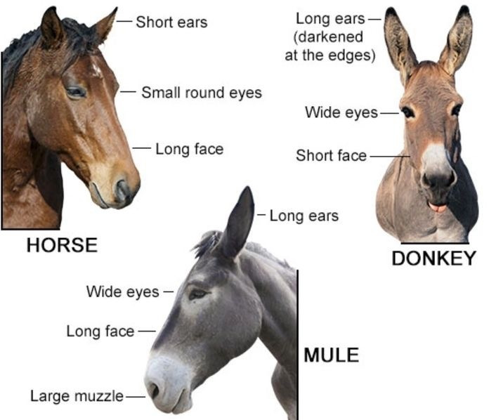 Despite the fact that both mules and hinnies each have one horse and one donkey parent, the two crosses generally differ from each other in appearance and stature and to some extent in temperament - a fact which has been recognised since they were first bred.